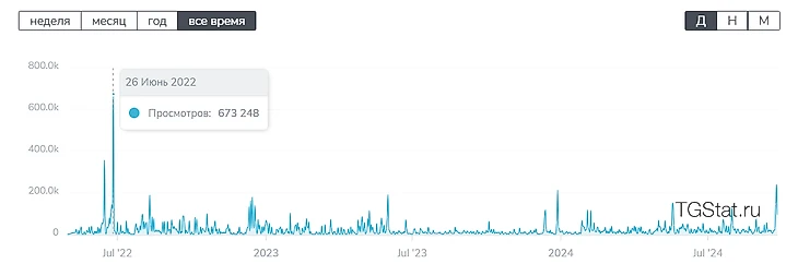 Если верить сервису TGStat, то суммарные 239 тысяч просмотров за сутки 24 сентября – лишь второй результат канала. 26 июня 2022-го было 637 тысяч – дата совпадает с окончанием турнира 3х3: того самого, где Роман Ротенберг ударил клюшкой 21-летнего хоккеиста «Лады» Илью Чабана. В тот день в канале было много постов, посвященных финалу соревнования, хотя если считать вручную, то до такой цифры они не дотягивают – впрочем, может быть, что-то было и удалено.
