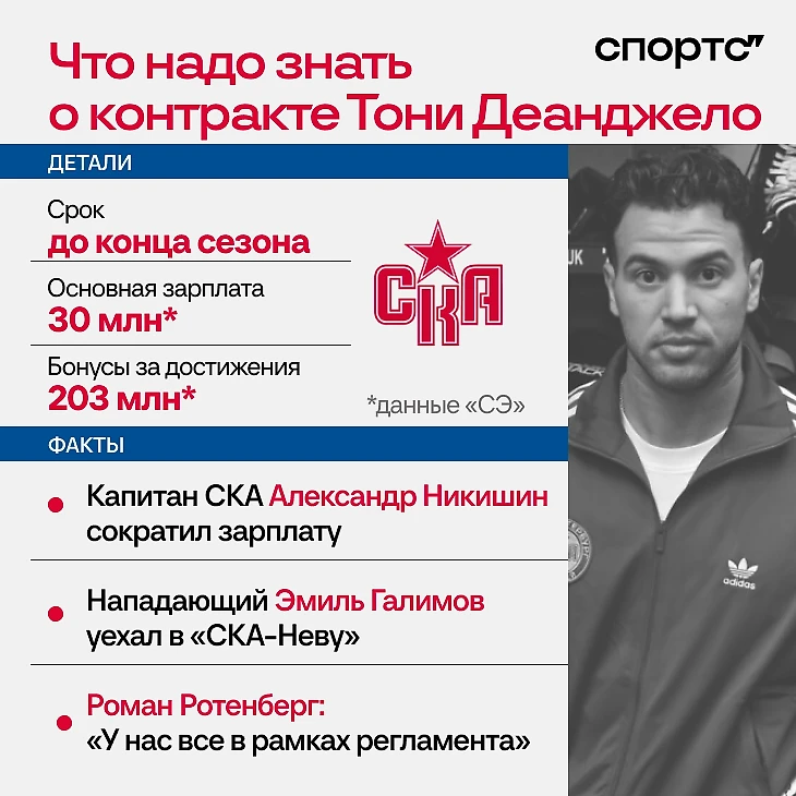 Перед объявлением Деанджело стало известно, что капитан СКА Никишин как раз пошел на изменение условий контракта. Сколько именно он потерял в деньгах – ясности нет. В его случае сыграла уже отработанная схема: клуб накинул Никишину бонусов, с которыми тот может получить еще больше. Видимо, так много, что Александр готов даже сесть в запас СКА.