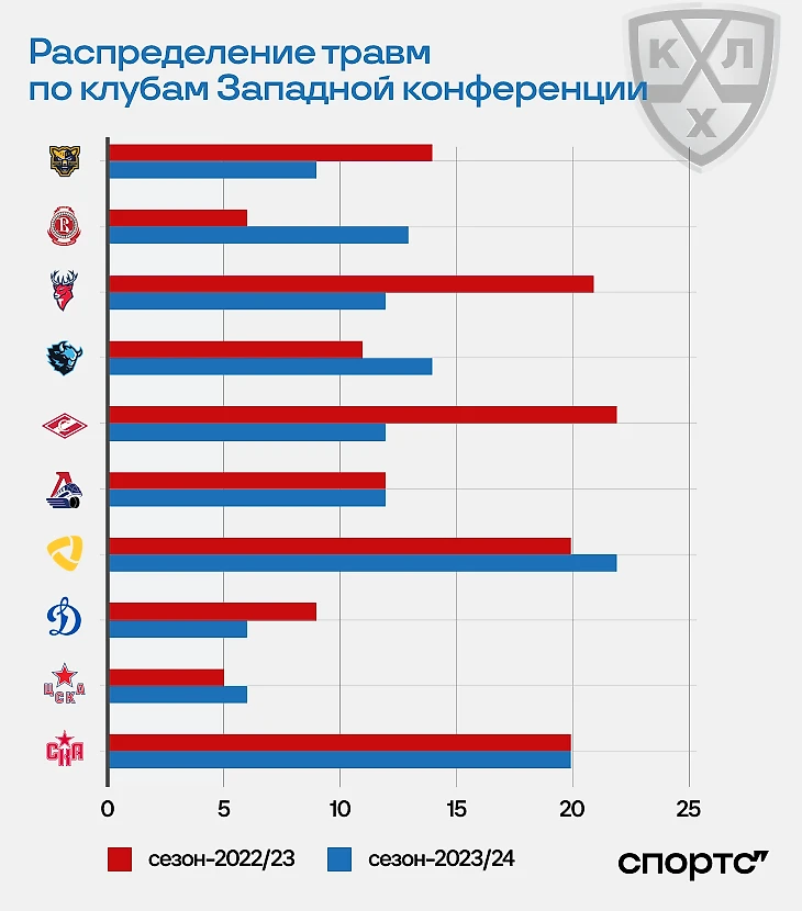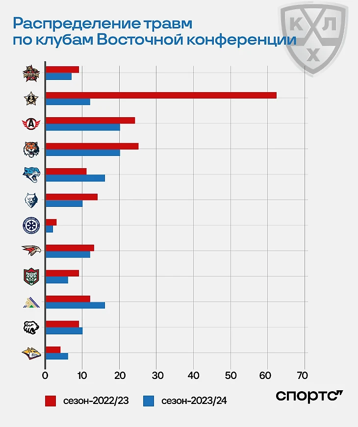 Еще одна инфографика в отчете отражала количество травм в каждом клубе КХЛ. По сравнению с сезоном-2022/23 на Западе травм стало меньше на 10%, а на Востоке – на 29,7%. Положительная динамика восточных клубов связана с улучшением ситуации в «Адмирале», где два сезона назад была аномалия травм.