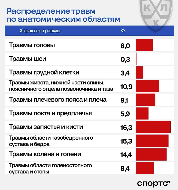 Все о травмах в КХЛ: нападающие страдают в 2 раза больше защитников, самый опасный месяц – сентябрь