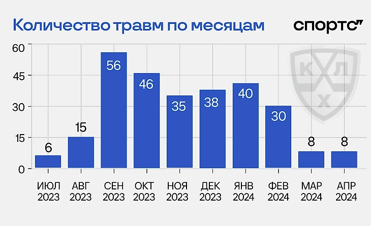 ● В сезоне-2023/24 игроки чаще всего травмировались в сентябре 2023 года (56). Похоже, хоккеистам непросто дался переход от предсезонки к полноценным матчам.
