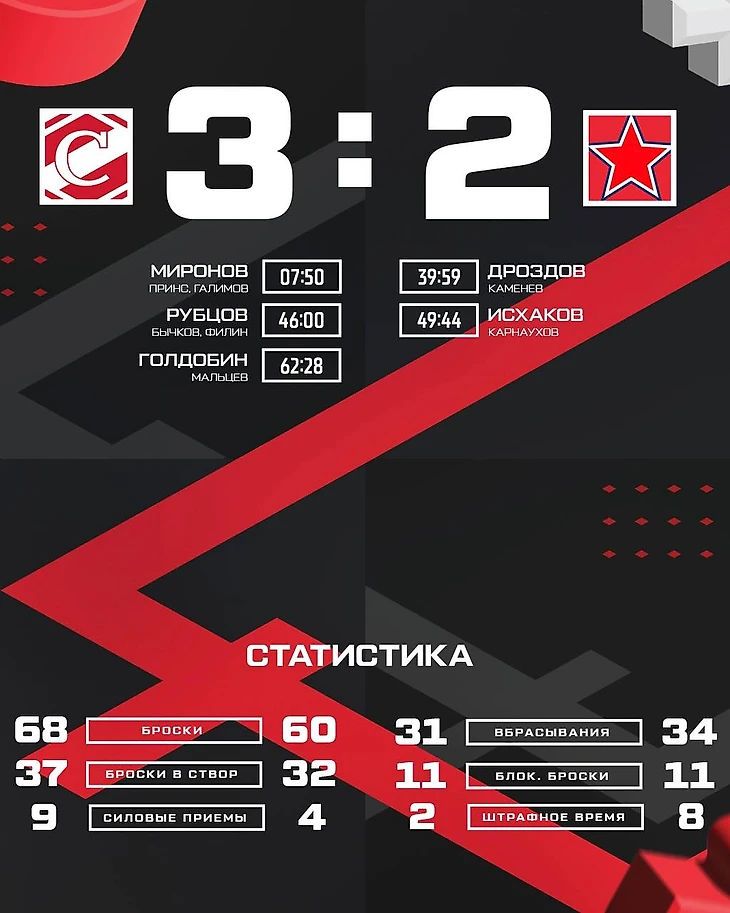 У победителей отличились игроки Андрей Миронов, Герман Рубцов и Николай Голдобин. В составе ЦСКА голы забили Иван Дроздов и Руслан Исхаков.
