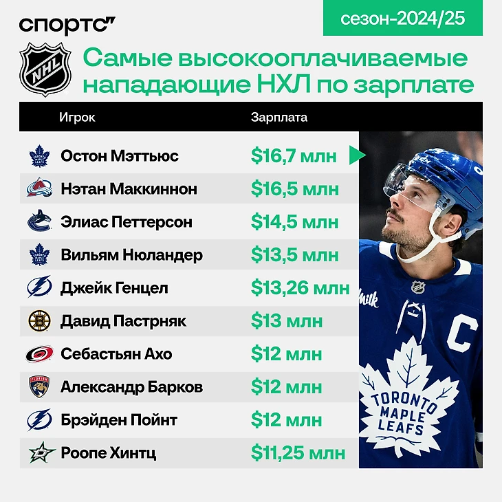 ● В топ-11 два партнера Мэттьюса по команде – Вильям Нюландер и бывший капитан Джон Таварес. Швед и канадец находятся на разных полюсах карьеры. Вильяму 28 лет, он в праймовом возрасте, в регулярке-2023/24 практически добил до сотни очков (98). Джону – 34, и болельщики «Торонто» с нетерпением ждут конца сезона-2024/25, потому что у Тавареса истечет контракт на $11 млн в год, который якорем тянет платежку «Лифс» на дно. В тот момент Джон выпадет не только из топ-10 самых дорогих игроков – вряд ли ему найдется место даже в первой сотне (сейчас ее замыкает Дилан Козенс из «Баффало» с $7,1 млн в год).