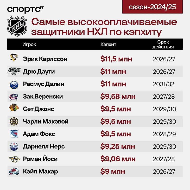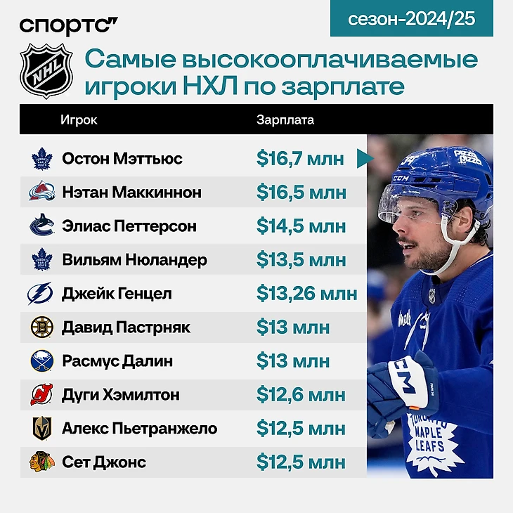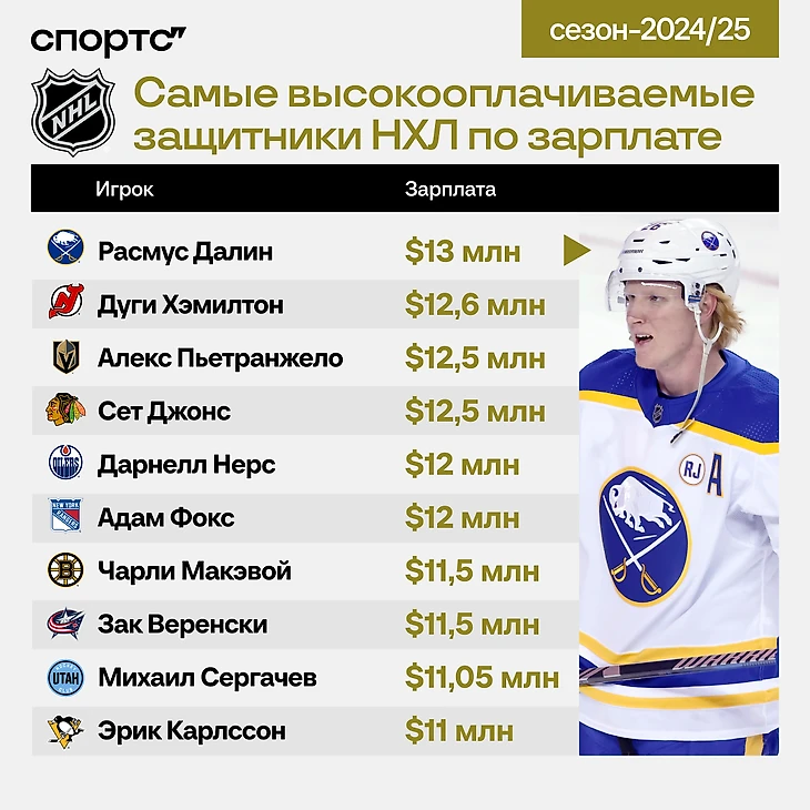 ● Лидер – уже не раз упомянутый Далин, за ним – Хэмилтон и Пьетранжело. Алекс за регулярку-2024/25 заработает $12,5 млн – столько же у Сета Джонса.