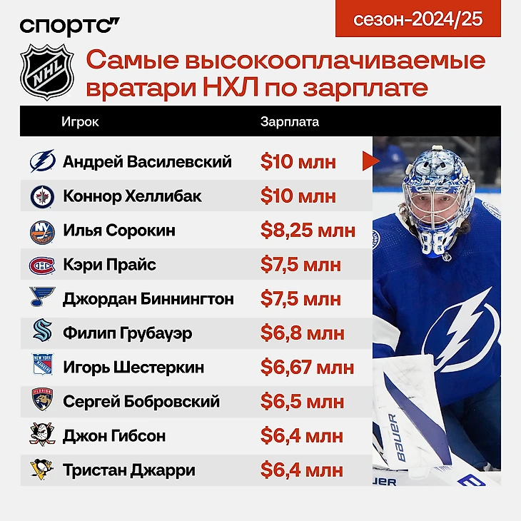 Контракты в сезоне-2024/25. Василевский получит больше всех вратарей, Панарина нет в топ-10 у напов