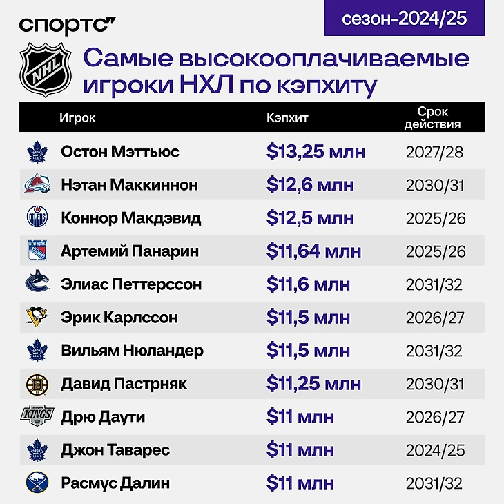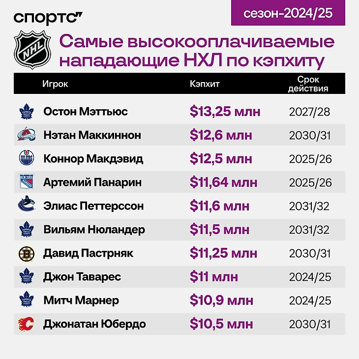 Кэпхиты может отличаться от зарплаты в конкретном сезоне (какая бы огромная она ни была – под потолок идет именно кэпхит), потому что контракты не всегда подразумевают равномерные выплаты каждый год. По разным причинам. Именно поэтому в нашем тексте есть таблицы с зарплатой конкретно в сезоне-2024/25 и таблицы с кэпхитом. Самое время перейти к ним.