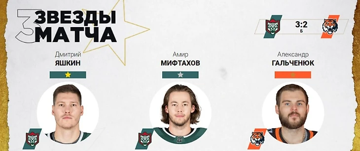 Звездами матча со стороны «Ак Барса» стали Дмитрий Яшкин ( гол + победный буллит, блокшот, два силовых приема) и Амир Мифтахов ( отразил 39 бросков из 41, выиграл буллитную серию).