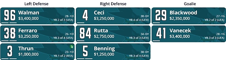 Его сменщиком станет Витек Ванечек. Веры в него у меня нет, как и в то, что за него можно получить какую-то компенсацию посредством обмена. Но предсезонку чех прошел неплохо, поэтому время покажет. Усложняет возможность обмена его истекающего контракта ($3,4 млн) то, что все 3 слота для удержания зарплаты заняты (Брент Бернс, Эрик Карлссон, Томаш Гертль), и ближайший освободится только 1 июля. Поэтому зарплату Ванечека контендеры (а кто еще будет его выменивать?) не смогут и не захотят уместить – это много для бэкапа. Разве что, нужно будет искать третью команду для удержания зарплаты (а это снизит для «Акул» компенсацию), или же принять кого-то ненужного другой команде (как было с Майком Хоффманом при обмене того же Карлссона).