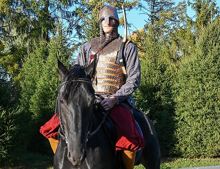 Основательно подготовился не только журналист. Перед игрой команду вывозили на фотосессию в богатырском обмундировании. Все по канону: верный конь, шлем и кольчуга.