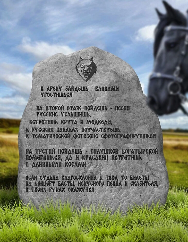 Еще одна оригинальная задумка – путевой камень, на котором перечислили все активности для болельщиков в тематический день. Фанаты могли угоститься блинами, поучаствовать в тематических конкурсах, послушать русские песни. Добры молодцы мерились силушкой богатырской, а девицы – длиной кос (самой длинной обещали приз).