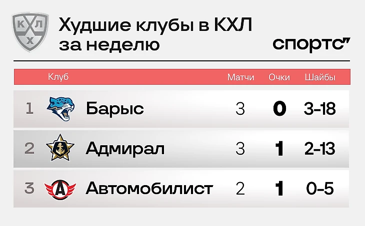 ● «Барыс» поменял главного тренера и подписал новых игроков, но продолжает проигрывать. При этом во всех играх команда много пропускает и совсем мало забивает. По-настоящему разгромным вышел матч с «Торпедо» (1:10).