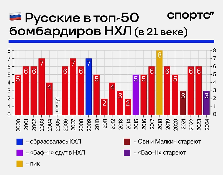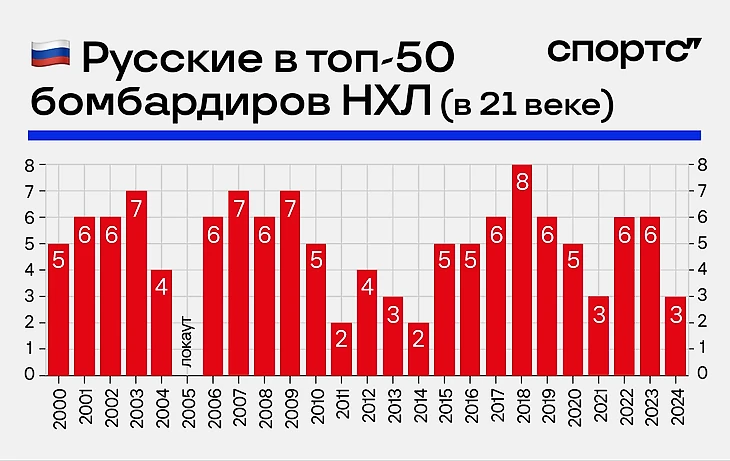 Вот что показывает динамика числа русских бомбардиров в топ-50 сезонов НХЛ в целом 21 веке.