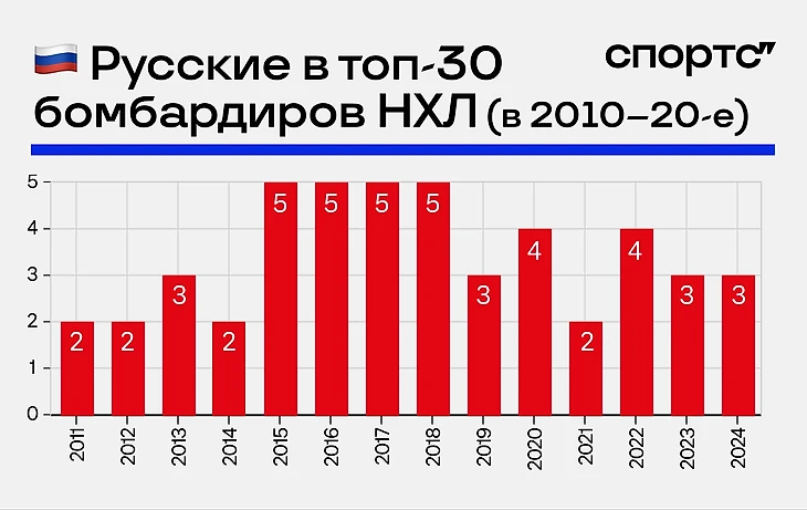 5. Пика русское присутствие достигает в сезоне-2017/18: Овечкин и Малкин (а с ними и Радулов) еще на продленном прайме, но уже в деле Кучеров и компания из Баффало-2011.