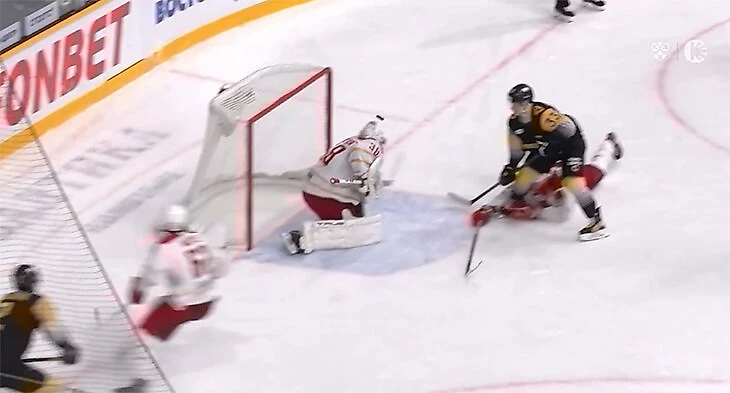 Шайба выскочила на пятак, когда Кейзер уже оказался отыгран. И все-таки он сориентировался в ситуации. Получилось очень изящно: вратарь облокотился на левый бок и замер в артистичной позе. Шайба от Эмиля Пьянова прилетела куда-то в его спину и выставленную руку с клюшкой.