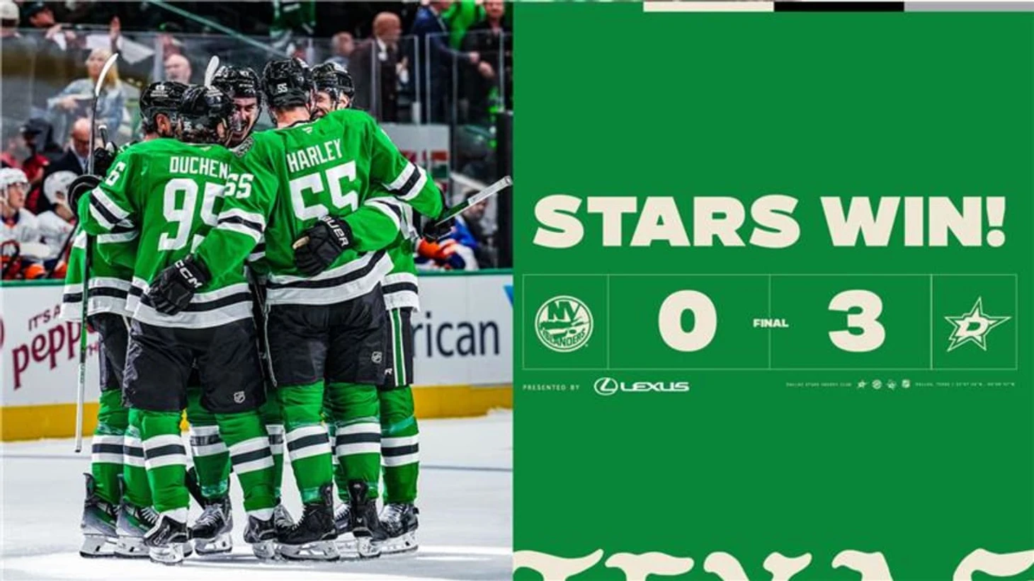 «Даллас Старз»-»Нью-Йорк Айлендерс» 3:0. Тайлер Сегин забросил 2 шайбы, Мэйсон Марчмент отдал 2 результативные передачи, Джек Оттинджер отразил 34 броска и сыграл первый сухой матч в сезоне.