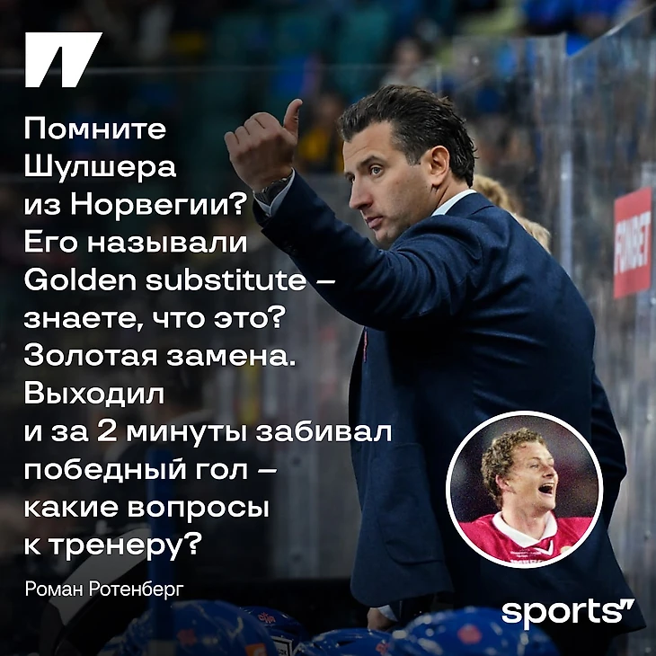 Чтобы закрепить вывод, Ротенберг перешел к другим видам спорта – и выдал: «А в футболе тоже есть такие примеры. Например, «Манчестер Юнайтед». Помните такого игрока, Шулшер? Из Норвегии. Его звали: «Golden substitute». Что это такое, знаете? Правильно, «золотая замена». Он выходил, ему Фергюсон давал две минуты, он забивал всегда победный гол. Какие вопросы к тренеру? Значит он так его подготовил».