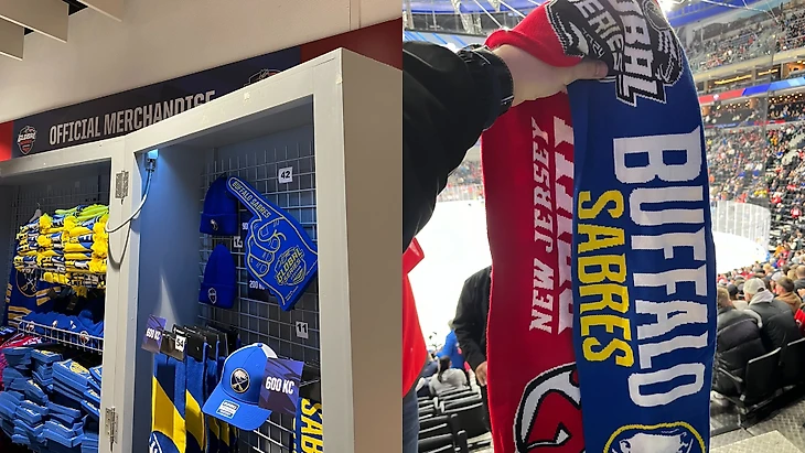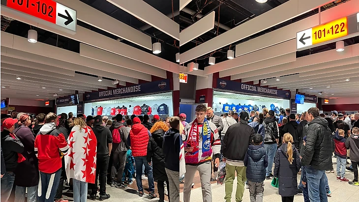 Вообще, самих точек для такого количества болельщиков показалось недостаточно. Одна на улице перед входом, одна в ТЦ и три в самой арене. Это вызывало постоянные долгие очереди, через которые даже подойти и прицениться не было возможности. Наибольший ажиотаж, ожидаемо, проходил у прилавков с товарами «Нью-Джерси».