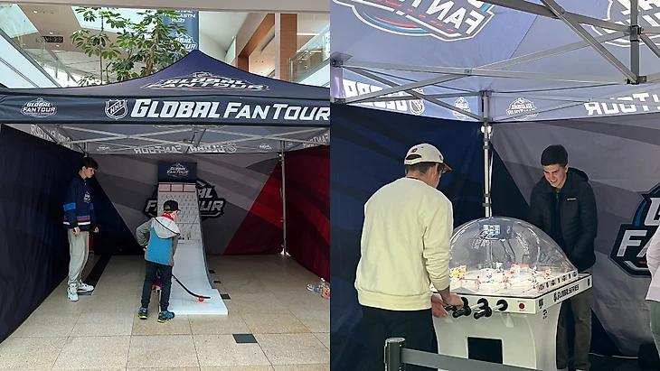 В палатках продавались только еда и пенные напитки, но стоило пройти внутрь ТЦ, как тут же оказываешься в большой зоне хоккейных активностей. В основном все точки были заняты детьми, но нашлись развлечения и для взрослых: можно было почувствовать себя в роли вратаря с помощью VR-очков или просто поиграть на пару в старый добрый настольный хоккей, в котором даже был приделан электронный куб с информационным табло.