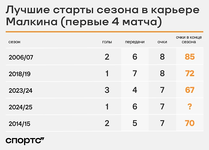 Малкин действительно проводит впечатляющий старт (для сравнения: у Кросби только 0+3), благодаря чему «Пингвинс» зацепили две победы в четырех играх. Вообще для 38-летнего Евгений довольно бодр – это один из лучших стартов в его карьере.