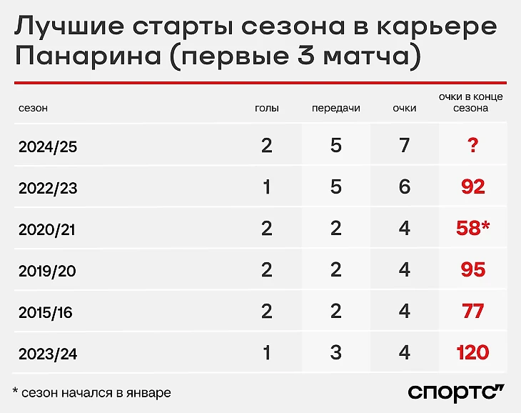 У Панарина, кстати, лучший старт в регуляках НХЛ – у него бывали первые матчи с минимумом очков (и даже без них), а тут прям сразу взялся за дело. Хотя в целом прямой закономерности между результативностью в октябре и итоговой статистикой не наблюдается – на дистанции он только прибавляет.