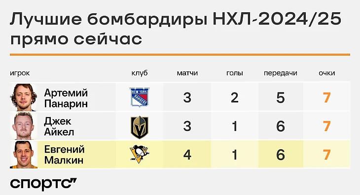 Понятно, что с полноценного старта прошла только неделя, и глобально эти цифры не так уж важны, но они наталкивают на простой и логичный вывод: Артемий Панарин и Евгений Малкин подошли готовыми к этому чемпионату. И матчи, состоявшиеся прошлой ночью, – тому подтверждение: оба нападающих набрали по 3 очка.