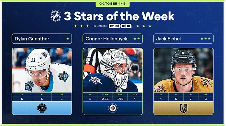 Нападающий хоккейного клуба «Юта» Дилан Гюнтер(Dylan Guenther), вратарь «Виннипег Джетс» Коннор Хеллbбак (Connor Hellebuyck) и центровой «Вегас Голден Найтс» Джек Айкел (Jack Eichel) были названы «Тремя звездами» НХЛ за неделю, завершившуюся 13 октября.