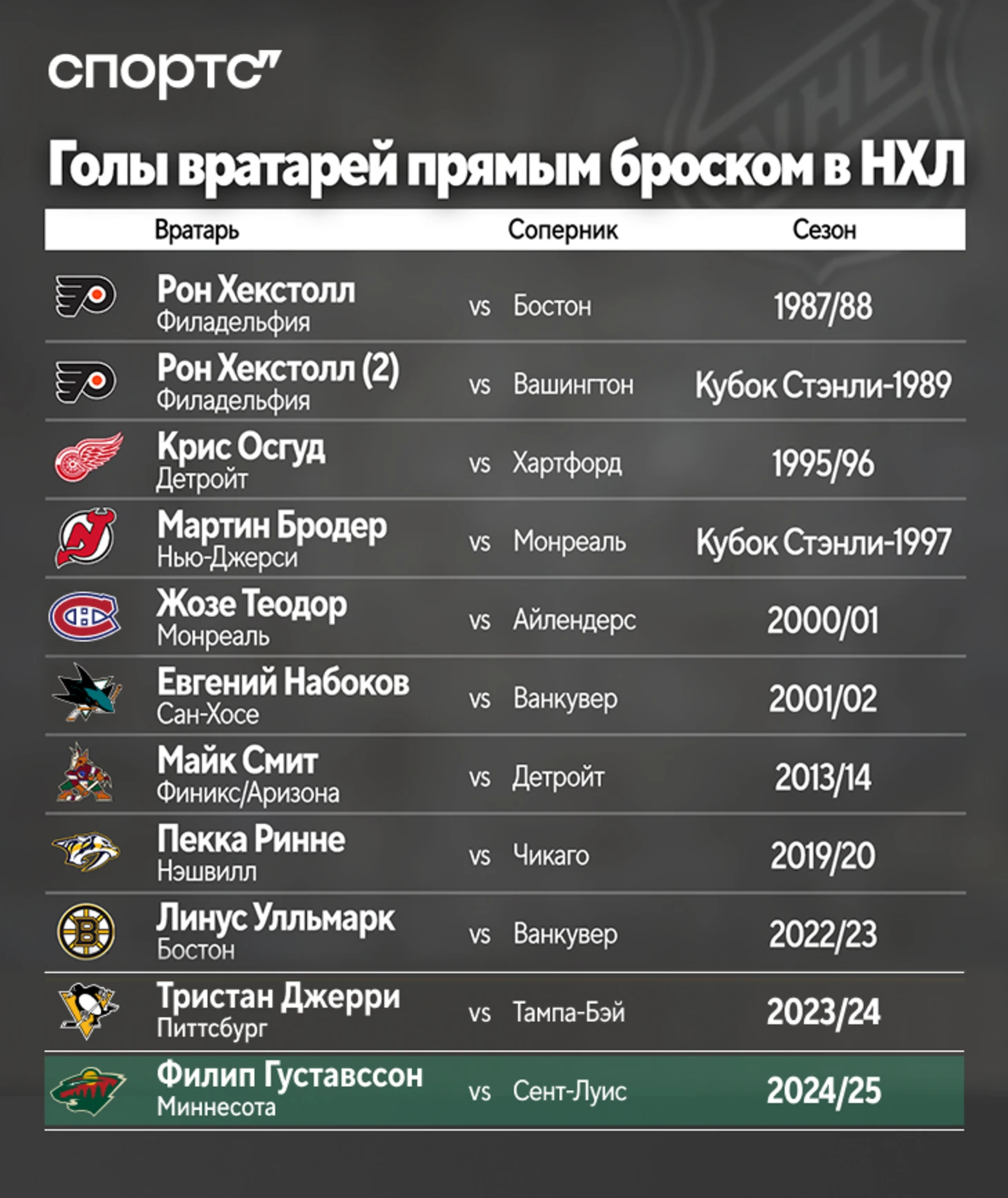 Кстати, это 11-й вратарский гол прямым броском в истории НХЛ. В последнее время голкиперы зачастили – забрасывают третий сезон подряд. В прошлой регулярке отличился Тристан Джерри из «Питтсбурга», а в сезоне-2022/23 – Линус Улльмарк из «Бостона». Раньше такой результативной серии не было никогда. Вот кто забивал до Филипа:
