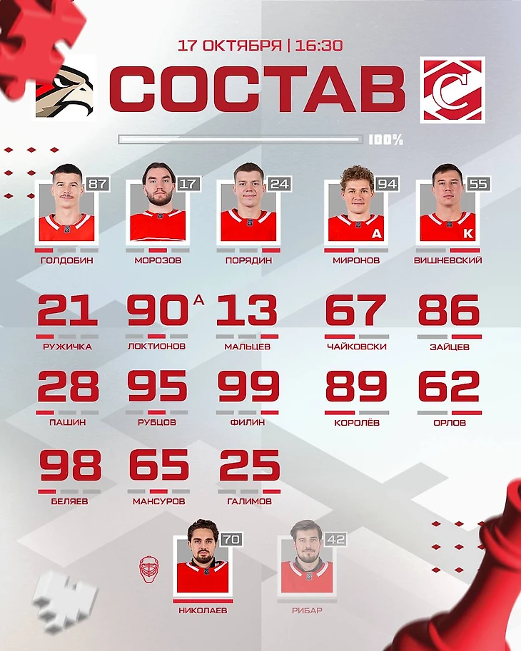 У Московского Спартака началась выездная серия игр, и не самая простая, особенно если учитывать проблемы красно-белых, однако у первого соперника москвичей проблем не меньше. 17 октября большой игровой день в КХЛ, центральный матч очевиден, это СКА - ЦСКА, который по итогу оказался не менее интересным как минимум по количеству заброшенных шайб, но мы как обычно смотрим игру с участием Спартака.