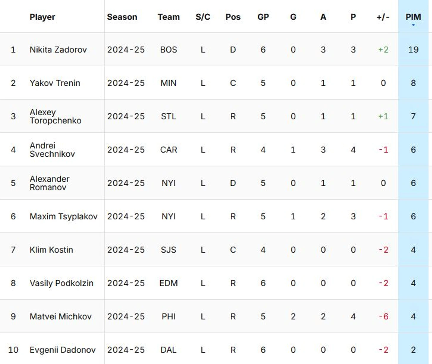Никита Задоров с первых матчей захватил лидерство по количеству штрафных минут и только наращивает его, в матче против Колорадо (5:3) получил 7 минут штрафа (2 минутное удаление и 5 минутное за драку с Мэттом Стейнбургом). На вторую строчку вышел Яков Тренин, у которого за 5 матчей четыре 2х-минутных удаления. На данный момент удаления получали 22 полевых игрока из 36.