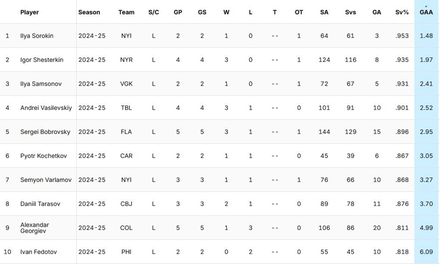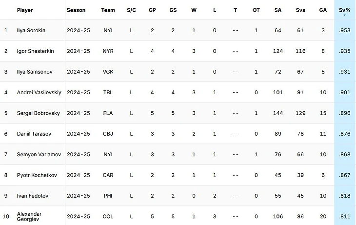 Матчей сыграно еще не так много, поэтому статистика по проценту отраженных бросков и коэффициенту надежности вратарей пока не сильно отличается. Топ-5 абсолютно идентичен в этих показателях для российских вратарей.