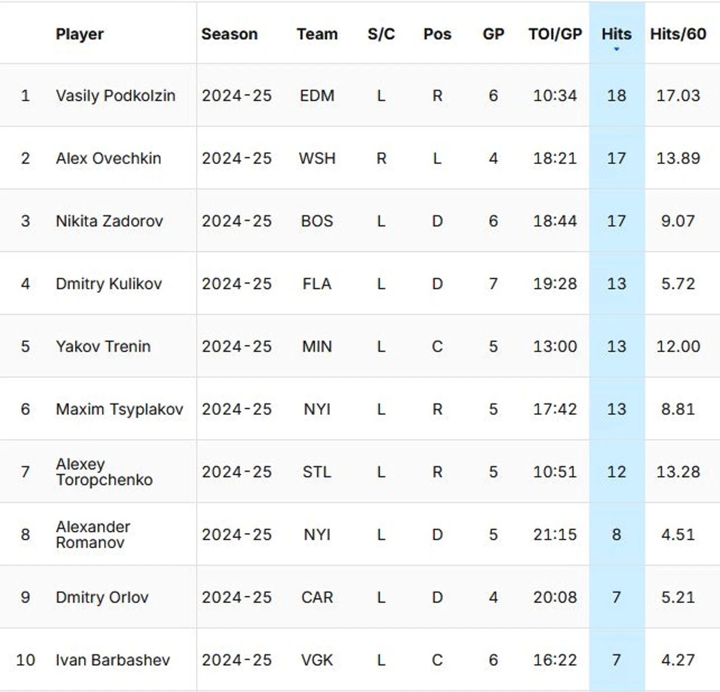 По силовым приемам единолично лидирует Василий Подколзин, который играет немного, но старается цепляться за свой шанс в Эдмонтоне. Он же с отрывом лидирует по среднему показателю силовых приемов на 60 минут игрового времени (17.03). Ну и стоит отметить Александра Овечкина, который в свои 39 лет продолжает играть агрессивно, делая большое количество хитов.