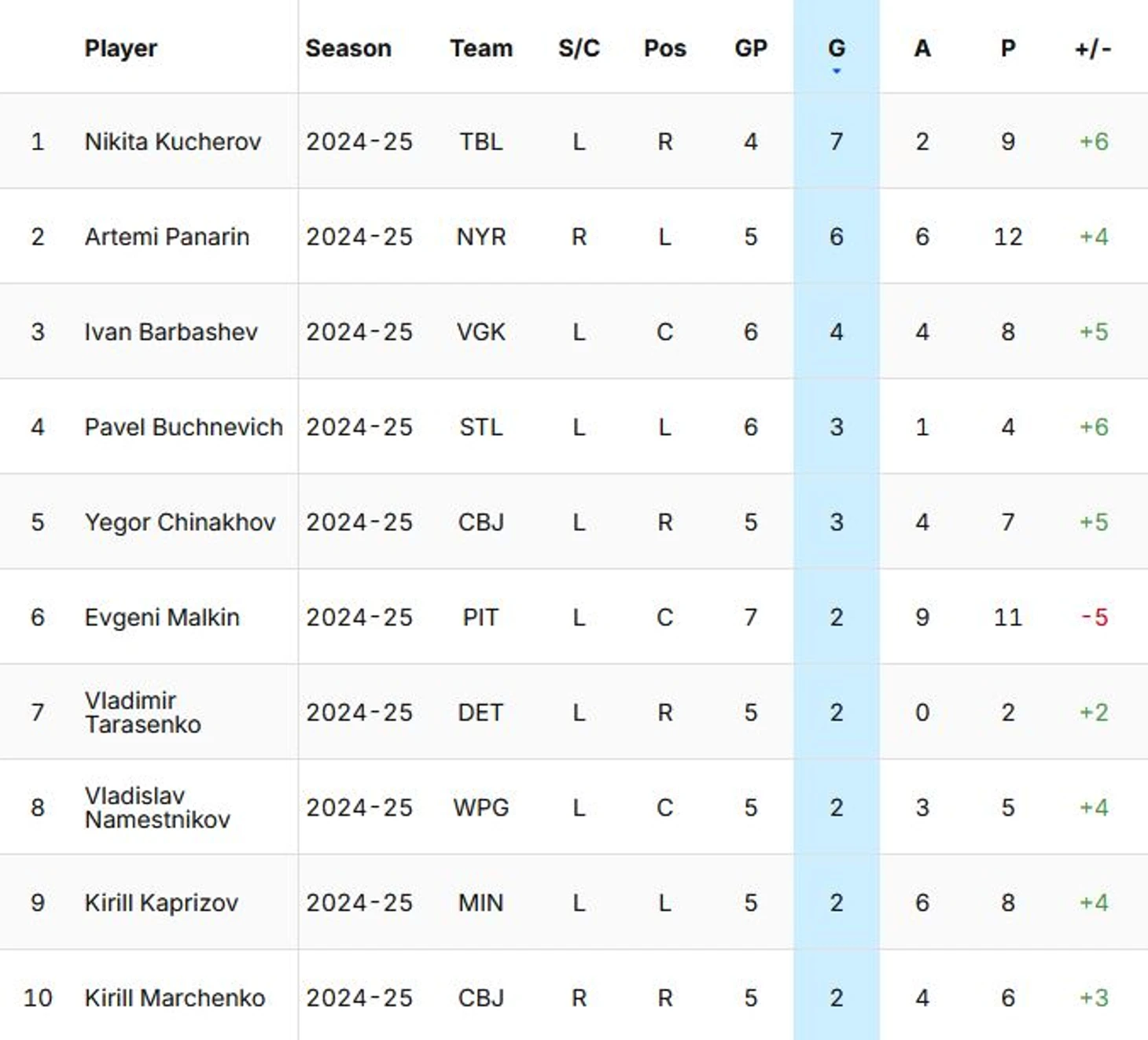 Лидер в списке бомбардиров по сравнению с прошлой неделей изменился, вместо Ивана Барбашева на первое место вышел Артемий Панарин (12 очков, он же лидер во всей НХЛ), который провёл отличную неделю, набрав 8 (4+4) очков в 3 матчах. В топ-3 помимо Панарина на данный момент входят Евгений Малкин и Никита Кучеров.
