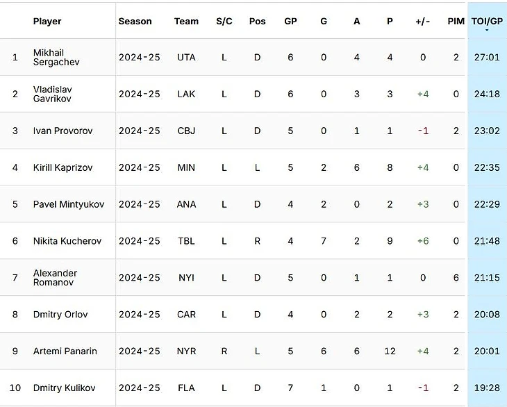 В топ-10 входят всего 3 форварда: Кирилл Капризов с 22:35 средним временем, Никита Кучеров с 21:48 и Артемий Панарин с 20:01.