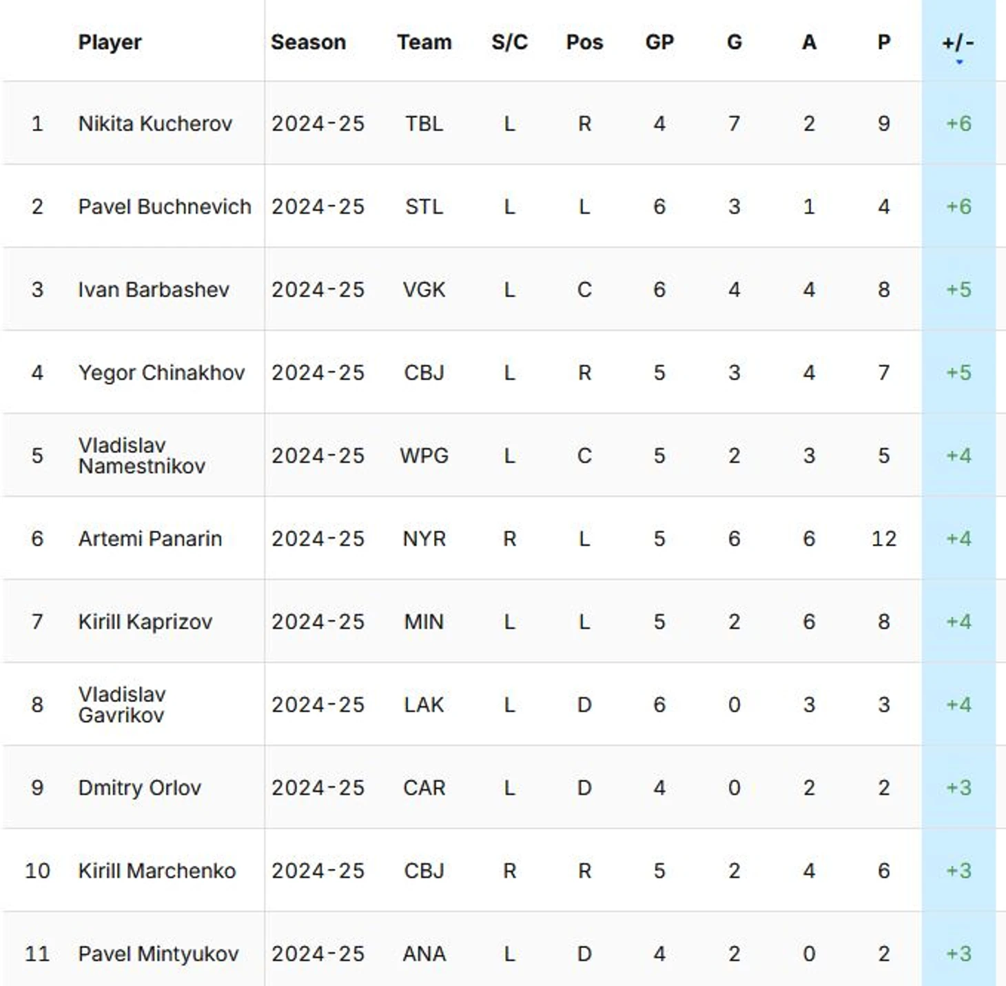 Первое место по показателю полезности делят Никита Кучеров и Павел Бучневич (по +6). Ровно половина наших ребят идет с положительной полезностью (18 из 36) после 3 недели НХЛ. Стоит отметить Егора Чинахова с +5, всё-таки Коламбус пропускает довольно много (18 шайб за 5 матчей).