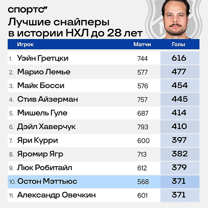 Но куда интереснее то, что гол для 27-летнего усача стал 371-м – и по этому показателю он ворвался в исторический топ для игроков до 28 лет. Интересно, что с 10-й строчки он вытеснил Александра Овечкина!