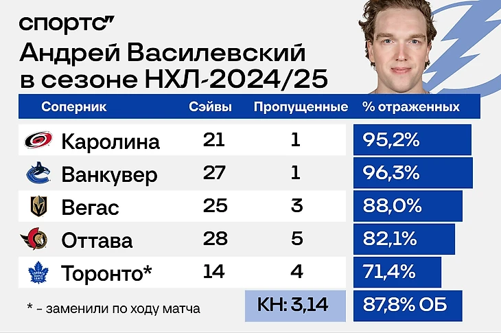 Старт Василевского в сезоне не назвать уверенным, но тут важно не количество его отраженных, а количество побед «Тампы»: 3 в 5 матчах – вполне достойный результат для этой сборки команды, и без Андрея этого бы не было.