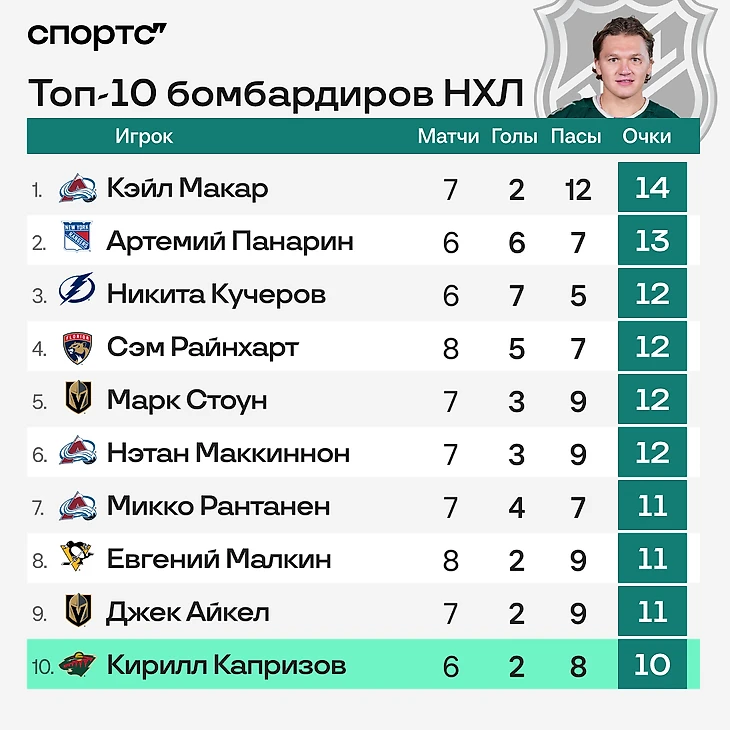 Потом «Миннесота» забросила еще, и на третий период в воротах «Флориды» вместо Бобровского появился Спенсер Найт. Пятая шайба «Уайлд» состоялась без участия Кирилла, но его статистика все равно впечатляет – роль россиянина в успешном старте «Уайлд» огромна. Капризов уже набрал 10 (2+8) очков в 6 матчах – он десятый бомбардир лиги.