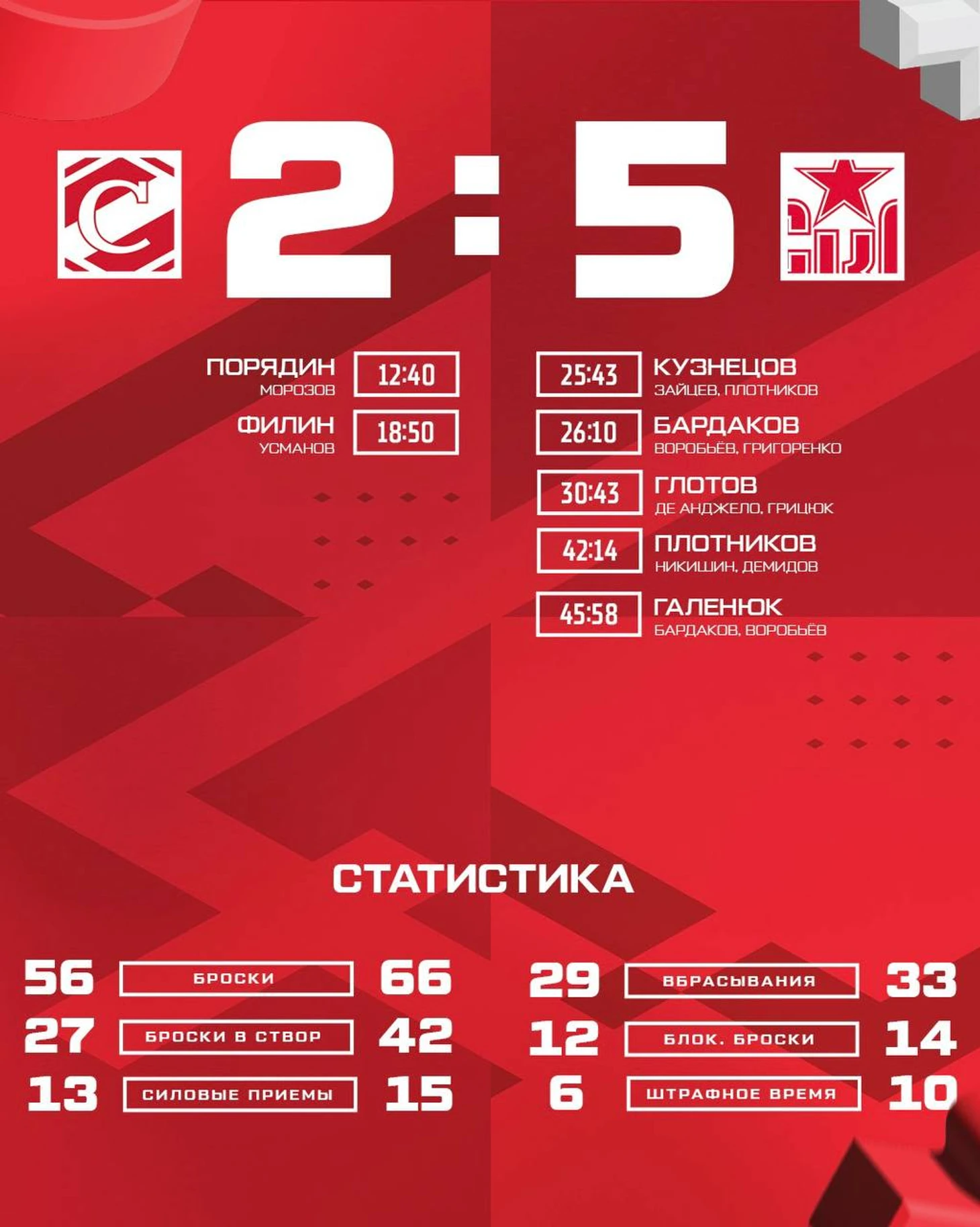 В составе победителей отличились Евгений Кузнецов на 26-й минуте, Захар Бардаков на 27-й, Василий Глотов на 31-й, Сергей Плотников на 43-й и Данила Галенюк на 46-й. За «Спартак» шайбы забросили Павел Порядин на 13-й минуте и Егор Филин на 19-й.