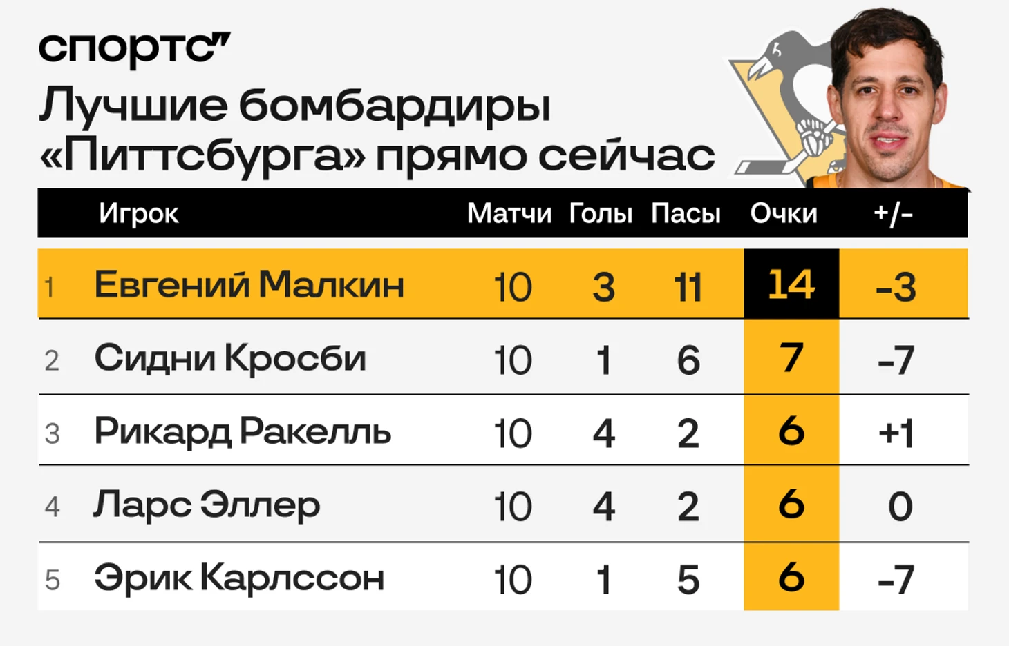 Но что гораздо хуже, и такой результативности в команде нет ни у кого. Малкин в этой регулярке набрал уже 14 очков – а партнеров, которые на постоянной основе помогали бы ему тащить команду или брали на себя эту роль вместо него, что-то не видать.