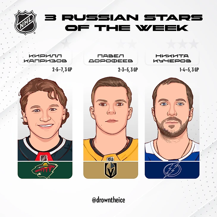⭐️ Ну, во-первых, Кирилл Капризов набрал больше всего очков на прошедшей недели, поэтому тут бесспорно, что он первая звезда. Во всех трех матчах набирал не менее двух очков, даже в том, где «Миннесота» каким-то странным образом проиграла «Филадельфии».