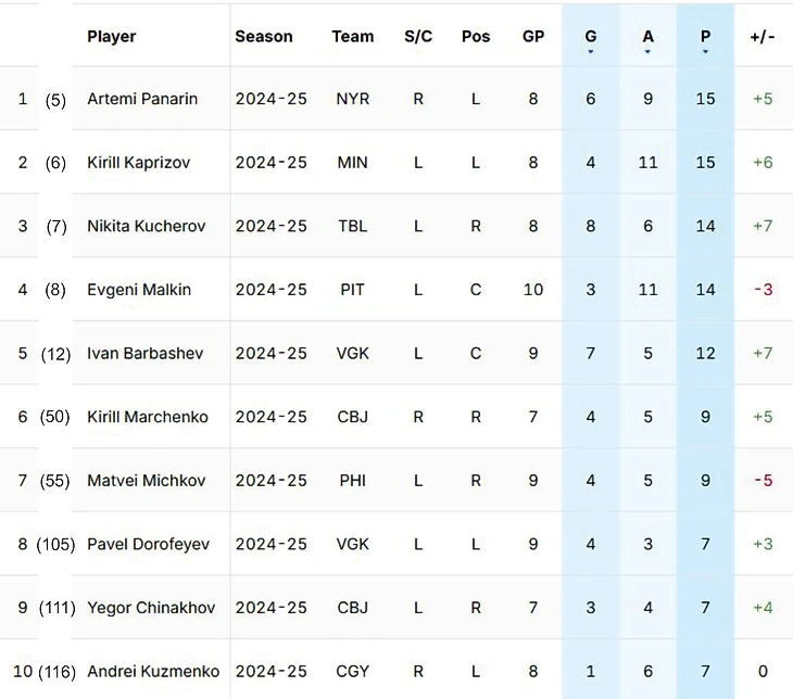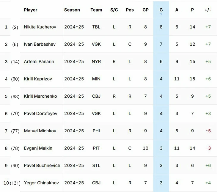 В топ-10 бомбардиров всей лиги идёт 4 наших игроков: Панарин (5 место), Капризов (6), Кучеров (7) и Малкин (8).