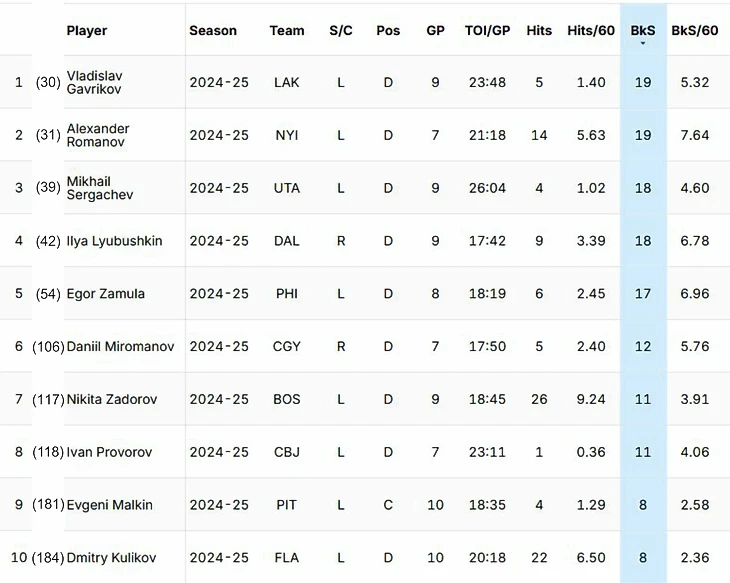 Лидеры по заблокированным броскам НХЛ сезона 24/25 среди россиян