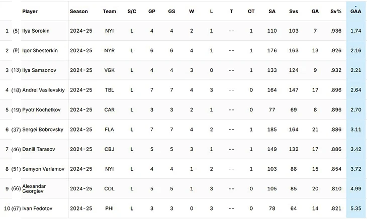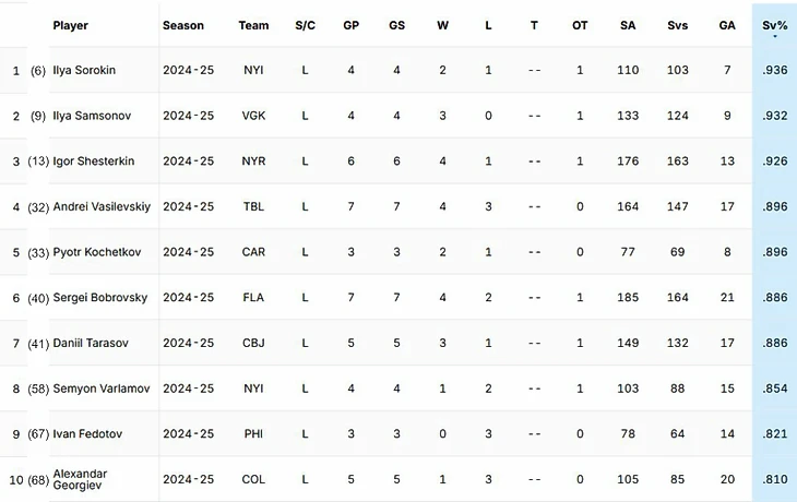 Лидеры по проценту отраженных бросков НХЛ сезона 24/25 среди россиян