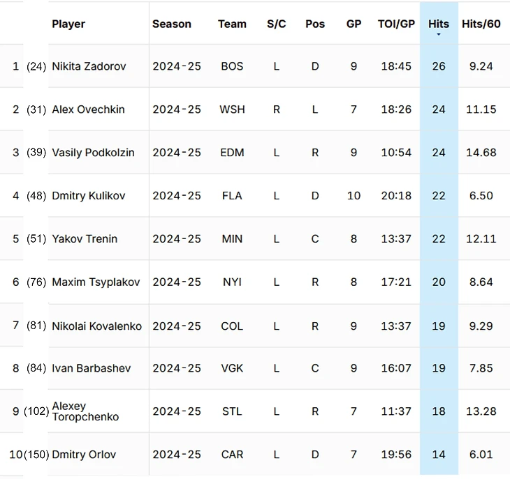 Лидеры по силовым приемам НХЛ сезона 24/25 среди россиян