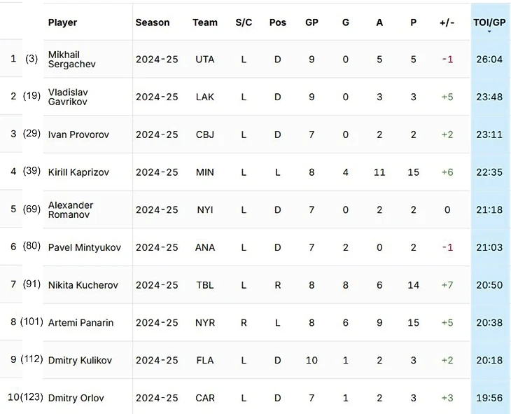 В топ-10 входят всего 3 форварда: Кирилл Капризов с 22:35 средним временем, Никита Кучеров с 20:50 и Артемий Панарин с 20:38.