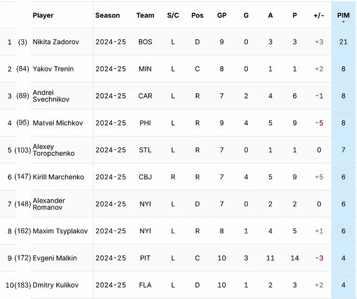 Лидеры по штрафному времени НХЛ сезона 24/25 среди россиян