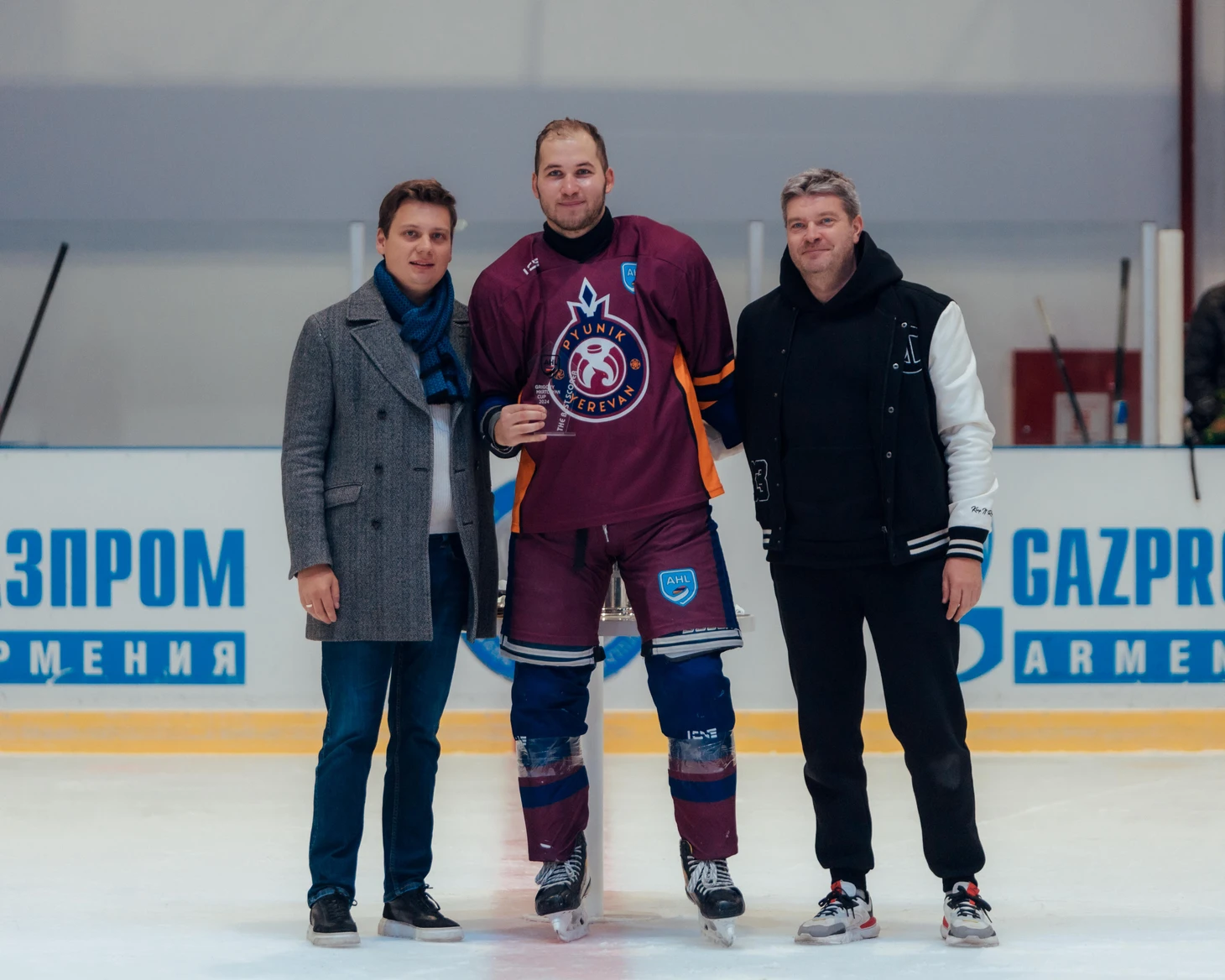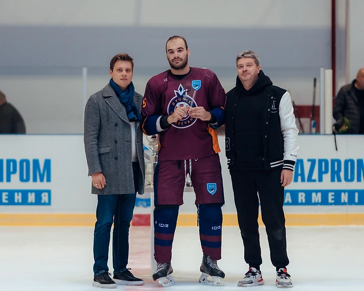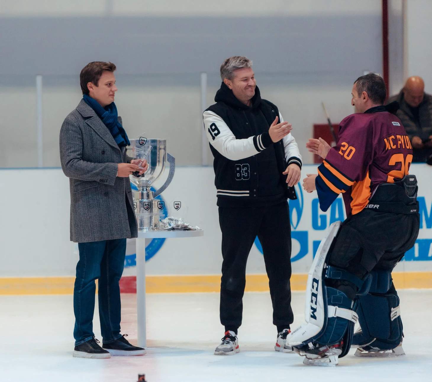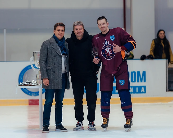 Награды хоккеистам вручили исполнительный директор АХЛ Никита Збышко (слева) и директор по развитию АХЛ Павел Егиазарян (справа). Игорь Кривых (по центру). ФОТО: АХЛ // Сергей Енгонян