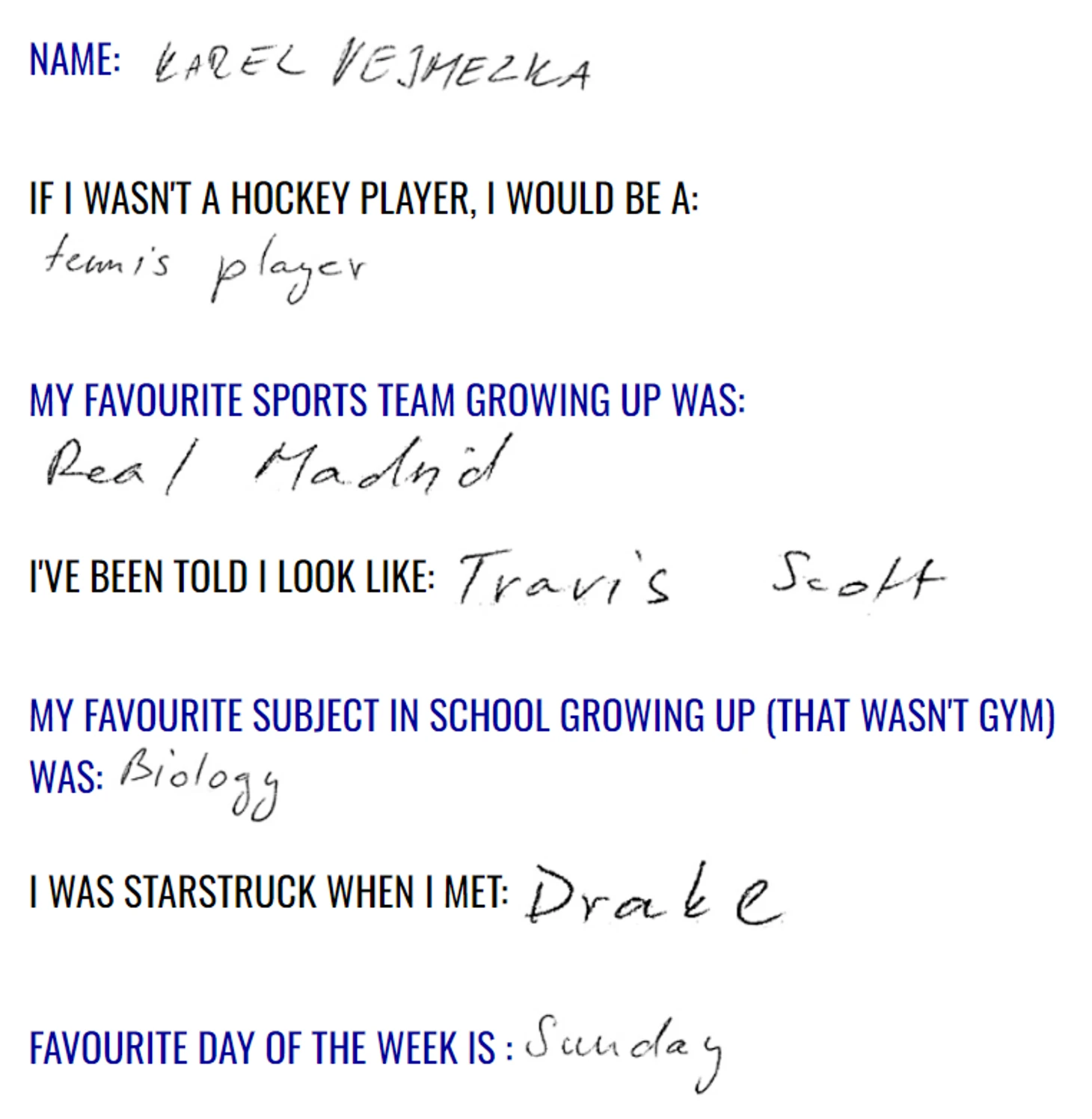 Это то, о чём я мечтал с тех пор, как сделал свой первый блокиратор из деревянной планки со шнурками. Мне всегда было интересно, каково это — играть против «Вашингтон Кэпиталз» и ждать удара Алекса Овечкина. Когда я был маленьким, моя бабушка пыталась научить меня играть в хоккей. Обычно она сидела на диване в гостиной и смотрела телевизор, но я никогда не оставлял её в покое, пока она не бросала в меня теннисный мячик. Дверь стала моей сеткой, моя кепка — моей перчаткой. И я никогда не позволял ей пробиться. - рассказывал Карел в интервью bezfrazi.