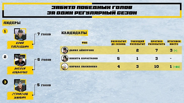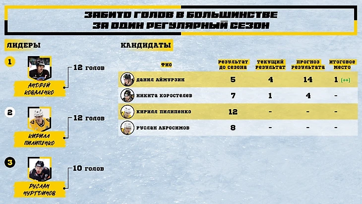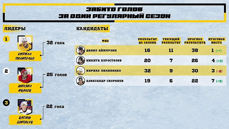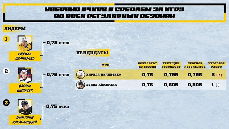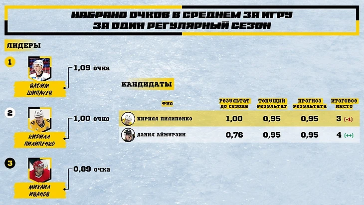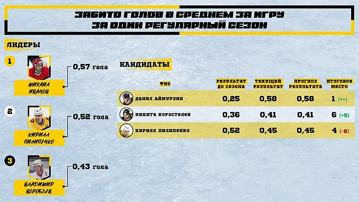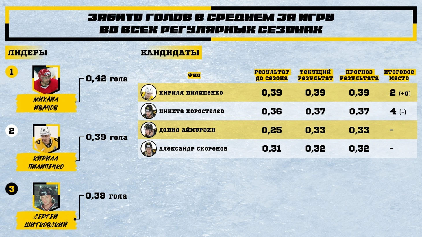 По голам в среднем за игру очень сложно догнать Михаила Иванова, но Аймурзин пока что держит прекрасный темп. Сместить с третьего места Владимира Воробьева неплохие шансы имеют и Данил и Пилипенко.