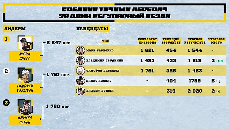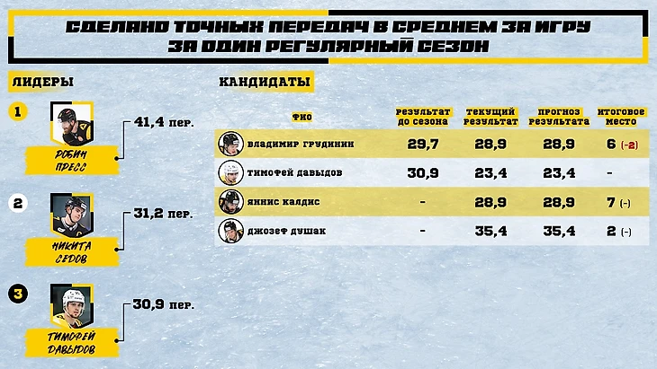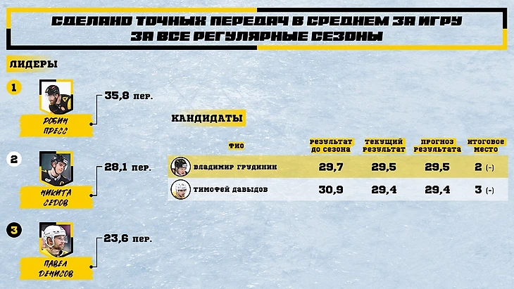 В количестве передач за игру за все сезоны (то есть более 1) теперь будут учитываться показатели и Грудинина и Давыдова, поэтому теперь именно они должны составить компанию Прессу в тройке лидеров.